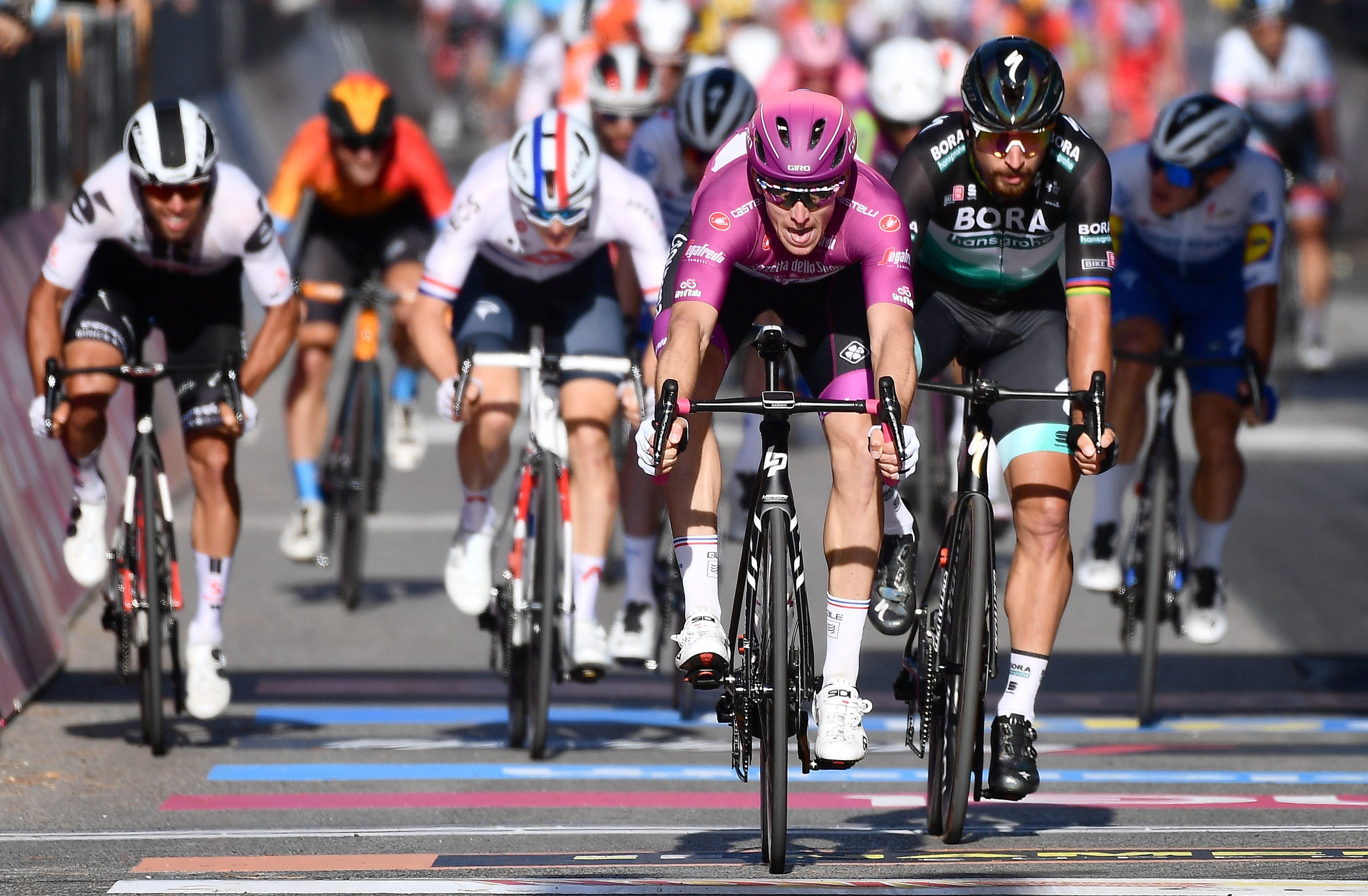 Ni el viento ni el baile rompen el pelotón, solo lo hacen las caídas, hijas de los nervios y la velocidad en las autopistas (la media de la etapa, cortita y cuesta abajo, sí, es de 51,234 kilómetros por hora, nuevo récord histórico del Giro), y Arnaud Démare, que, lejos de su lanzador y mal colocado, demarra en diagonal en el sprint, de lado a lado de la calzada en el puerto de Brindisi, y, tras desazonar a los rivales, a Sagan, que no sabe abrirse y suma, muy enfadado, su tercer segundo puesto en el Giro (y los estadísticos lo añaden a sus 22 segundos en el Tour y ocho en la Vuelta, 33 en total, más del doble de las 16 victorias conseguidas entre Tour, 12, y Vuelta), a Gaviria, que se frena, a Hodeg, que no se entiende con Ballerini, y aun esprintando fatal, tal velocidad alcanza, gana como quien lava su tercera etapa en el Giro tan veloz. La edad del pavo ya le pasó al eslovaco, 30 años de edad, 10 en la elite del ciclismo, desbordado por los más jóvenes, y abandona la llegada melancólico, agitado, con malestar psíquico, mordido por la tarántula de la derrota.