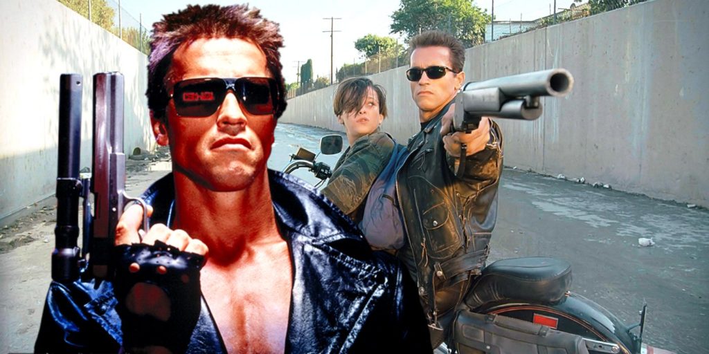 Terminator 2: el día del juicio siguió la premisa de viajar en el tiempo de la primera película pero con un giro (y una historia mejor y más desarrollada): esta vez, un Terminator reprogramado fue enviado en el tiempo para proteger a un joven John Connor (Edward Furlong), mientras que un Terminator más avanzado, conocido como T-1000 (Robert Patrick) ahora fue enviado a matarlo. La película está llena de escenas de acción, de las cuales la más impresionante sucede en el primer acto de la película, después del primer encuentro de John con ambos Terminators, y refleja una escena de la primera película.