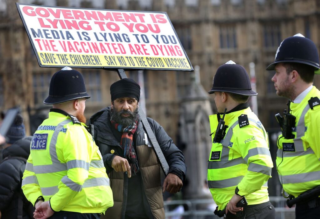 Un antivacunas habla con un grupo de policías el pasado 17 de febrero en Londres, Inglaterra.Martin Pope (Getty Images)