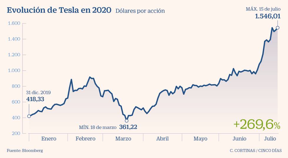 Primero, los datos. Tesla, el fabricante de coches eléctricos, tocó el lunes su máximo histórico, muy cerca de los 1.800 dólares por acción. A mediados de marzo (cuando la propagación del Covid-19 desató una oleada de pánico en los mercados bursátiles), sus títulos valían 361 dólares. Es una subida del 396% en cuatro meses.