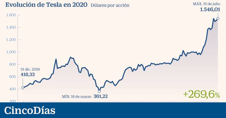 Primero, los datos. Tesla, el fabricante de coches eléctricos, tocó el lunes su máximo histórico, muy cerca de los 1.800 dólares por acción. A mediados de marzo (cuando la propagación del Covid-19 desató una oleada de pánico en los mercados bursátiles), sus títulos valían 361 dólares. Es una subida del 396% en cuatro meses.
