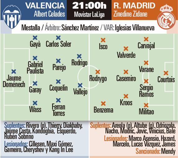 Zidane recuperará el 4-4-2 en Mestalla con Benzema y Rodrygo arriba. El joven brasileño le ha ganado la partida a Bale y Vinicius para ser el recambio del lesionado Hazard. La lógica dice eso, pero con Zidane en el banquillo, tampoco hay que desterrar la idea de ver a Bale titular jugando al lado de Benzema arriba. El que sí parece seguro para jugar en el lateral izquierdo es Militao. El brasileño jugará por el sancionado Mendy y ha adelantado a Nacho que lleva más de dos meses sin jugar por lesión y Zidane no le dio ni un minuto en Brujas pensando en el duelo de hoy.