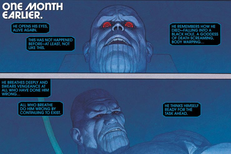En Eternos # 6, los fanáticos ven cómo Thanos volvió a la vida después de su fallida resurrección por parte de Hela. El Eternal Phastos resucitó a Thanos para destruir la Gran Máquina, dotándolo de órganos internos sintéticos especialmente diseñados para mantenerlo bajo control. La Gran Máquina, una expresión de la conciencia de la Tierra, narra el regreso de Thanos a la conciencia, contando sus primeros pensamientos sobre el despertar. “Respira hondo y jura venganza por todos los que le han hecho mal … Todos los que respiran le hacen mal al seguir existiendo”. Si bien Thanos es temporalmente derrotado por los Eternos en este problema, la revelación de que no solo busca o desea honrar a la Muerte, sino que se siente personalmente perjudicado por toda la vida, deja en claro cuán profunda es la oscura filosofía de Thanos.