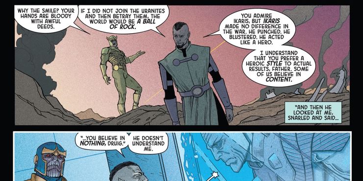 En Eternos: el hereje #1 por Kieron Gillen, Ryan Bodenheim y Edgar Salazar, Thanos se ha convertido en el Primer Eterno y, por lo tanto, en el líder de la raza inmortal de seres con superpoderes. Ahora que está a cargo, Thanos fue guiado a través de su historia ancestral por Druig, quien llevó al Titán Loco a encontrarse con alguien aún más despiadado que el propio Thanos. Cuando Thanos se encontró cara a cara con Uranos, el Eterno que una vez planeó la desaparición de todo el planeta Tierra y desde entonces había sido encarcelado por sus crímenes, los fanáticos se enteran de que Druig es en realidad el héroe que nadie sabía que podía ser.