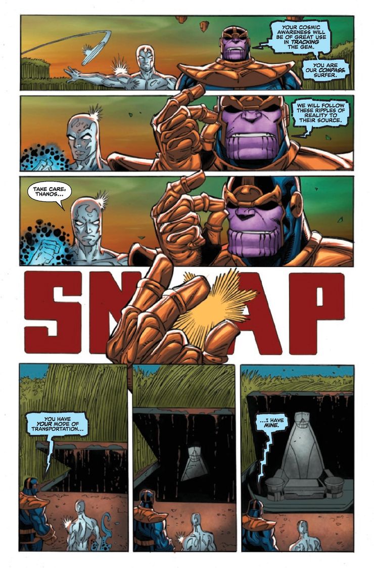 El chasquido de Thanos es el gesto más icónico del Universo Marvel, y Mad Titan ahora lo está usando para burlarse de su nuevo aliado poco probable, Silver Surfer.