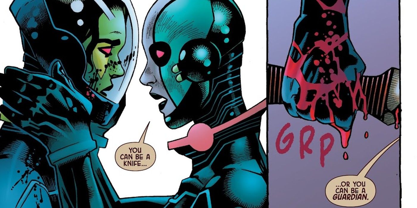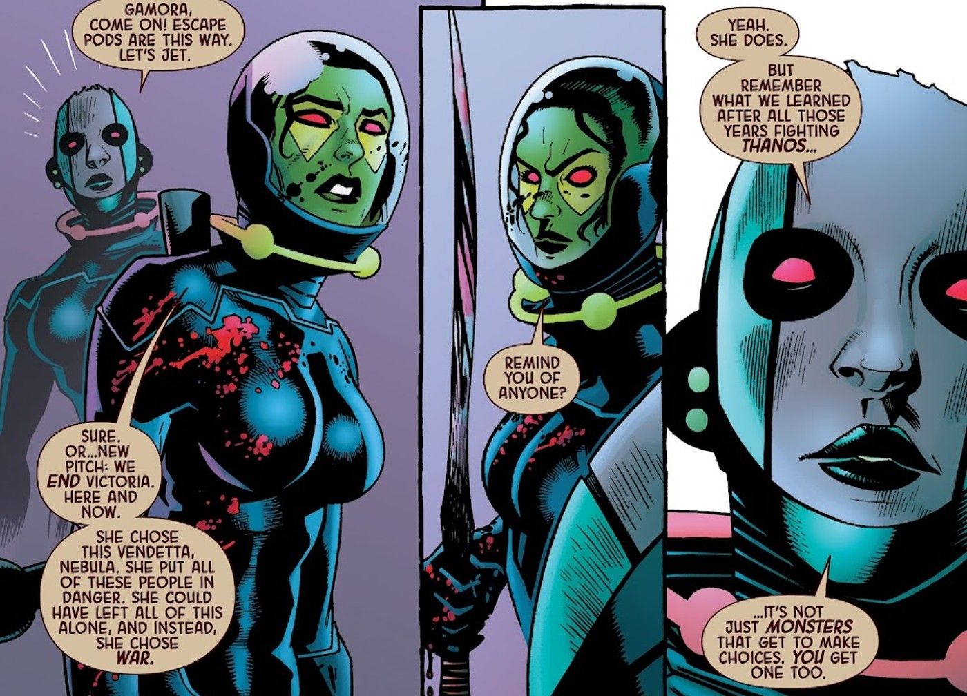 Disgustada, Gamora está lista para acabar con Victoria para siempre, pero Nebula le recuerda por qué eso no los diferenciaría de monstruos como Thanos.