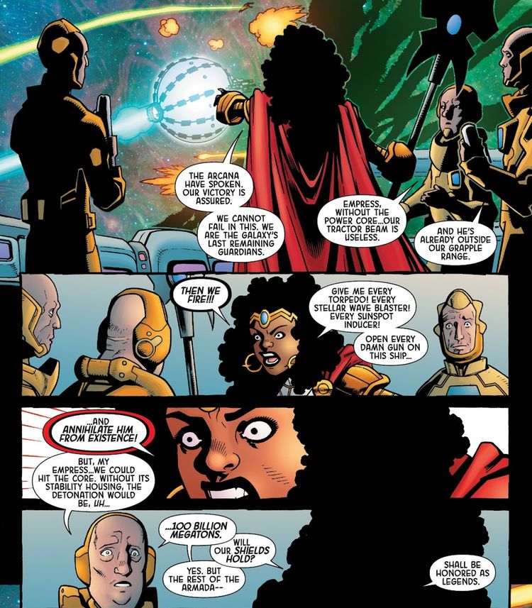 - La conclusión de la serie Guardianes puede reducirse en última instancia a la decisión de la emperatriz Victoria de seguir el camino de los Guardianes o convertirse en Thanos.