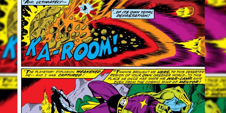 En Hombre de Acero # 55 de Jim Starlin, Mike Freidrich, Mike Esposito, John Costanza y Roy Thomas, los lectores conocen Drax the Destroyer y Thanos. El origen de Drax, donde el padre de Thanos, Mentor, le dio poderes increíbles para destruir a su hijo, muestra su primera pelea. En un planeta lejos del sistema solar de la Tierra, Thanos y Drax intercambian golpes en una batalla épica que sacudirá el mundo. Sin embargo, durante el intercambio, los poderes de Thanos combinados con los de Drax dieron como resultado que el planeta en el que lucharon explotara, lo que llevó a la captura del héroe.