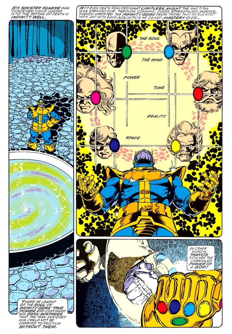 En Guantelete infinito #1 por Jim Starlin y George Pérez, Thanos se embarca en su búsqueda de las Gemas del Infinito, que le otorgan un poder inconmensurable. De entrada, parece un gran gesto hacia Mistress Death, con Thanos buscando la gloria”ser digno de [her] amor.” Sin embargo, esta puede no ser la historia completa. Cuando la Muerte le pide que elimine a la mitad de la población del universo por ella, Thanos la convence de que las Gemas del Infinito son la única forma en que puede completar esa tarea. Thanos, que ya es un titán poderoso con un ejército a su disposición, fácilmente podría dejar un impresionante rastro de destrucción a su paso, pero busca un poder mayor, un poder que solo se puede obtener a través de las Piedras.