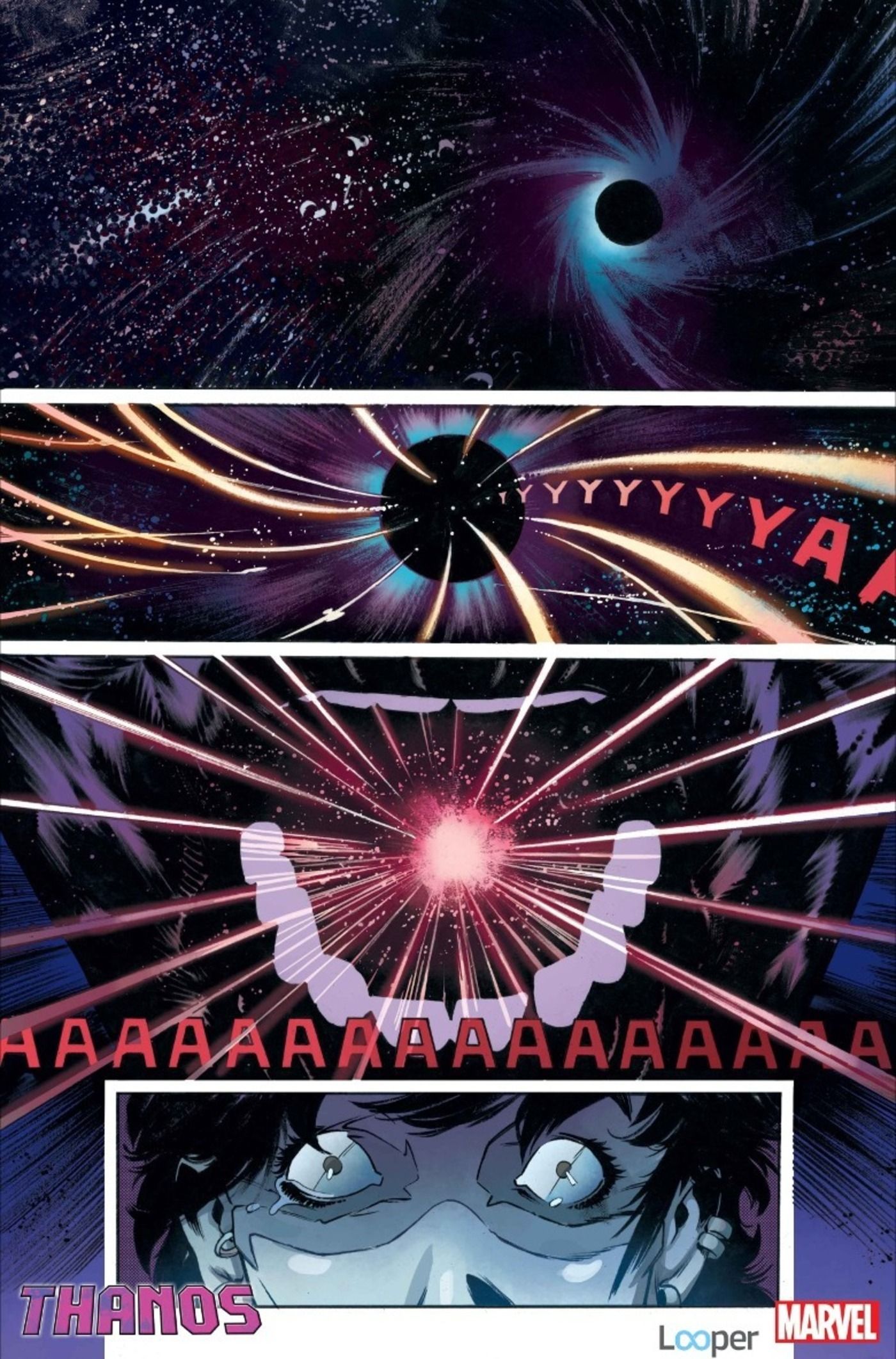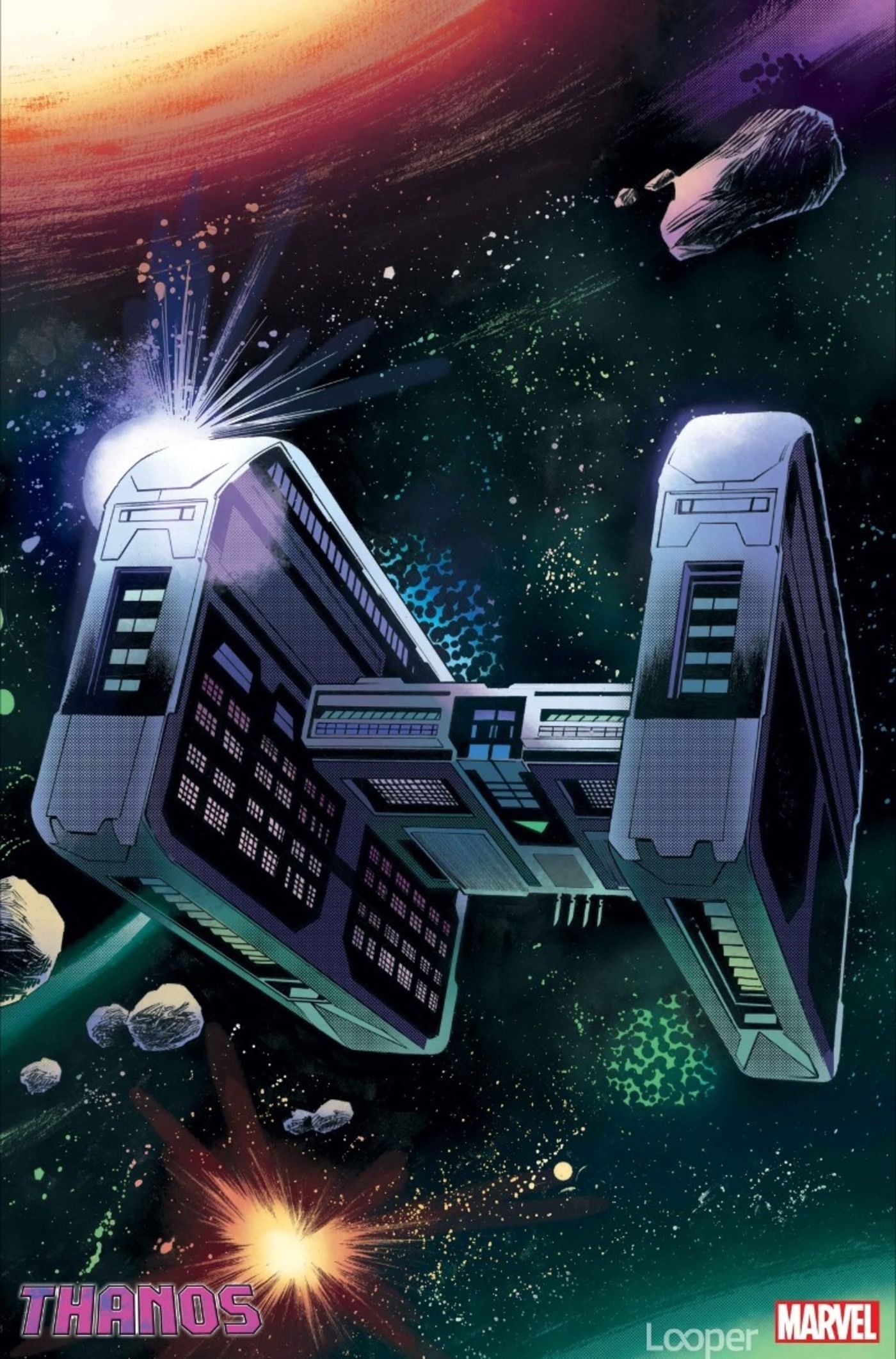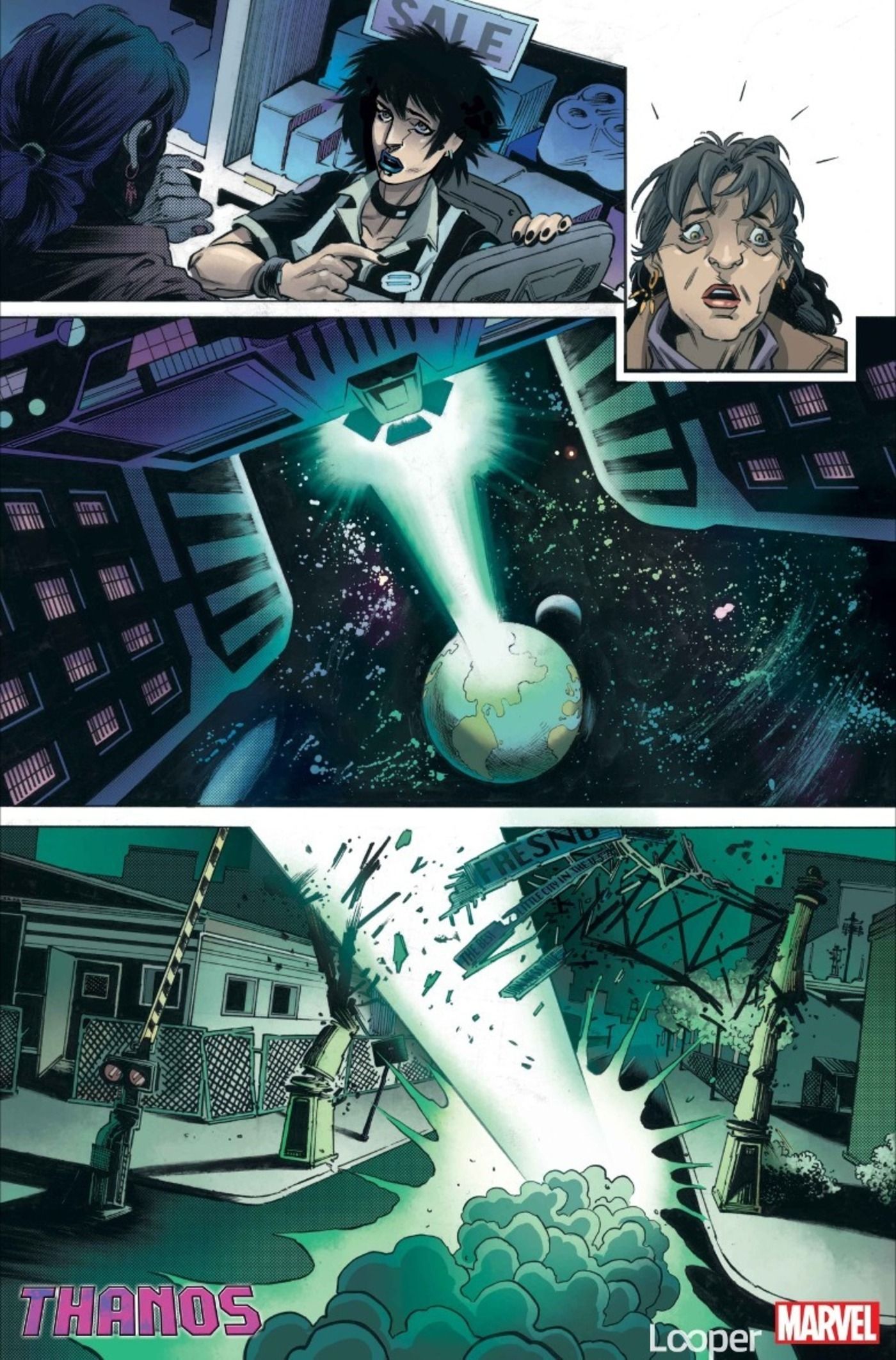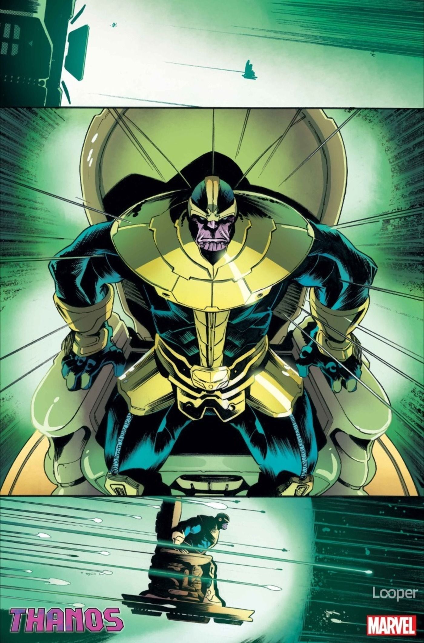 Looper compartió una vista previa de Thanos #1 – del escritor Christopher Cantwell, con arte de Luca Pizarri – que mostraba a Thanos regresando a la Tierra de manera espectacular, montado en su trono de destrucción en curso de colisión directa con la Tierra.