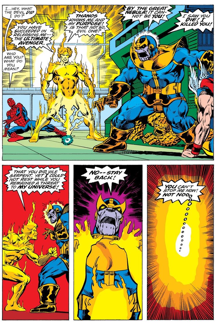 Warlock y Thanos son extremadamente diferentes en términos de origen y poder. Los poderes de Thanos incluyen fuerza, invulnerabilidad, telepatía, vuelo y proyección de energía a nivel de Hulk, pero estos palidecen en comparación con su intelecto. Aunque descuida muchas de las habilidades de Thanos, el MCU hace un gran trabajo al demostrar cuán rara vez recurre al combate físico personal. El Titán Loco usa su intelecto para obtener fuentes de poder (como las Piedras Infinitas) que empequeñecen sus habilidades naturales. Esto es más un cumplido para el intelecto de Thanos que un desaire a su fuerza. Este Titán se ha enfrentado cara a cara con personajes como Hulk, Silver Surfer, Black Bolt e incluso Galactus. En la primera aparición de Thanos en Hombre de Hierro # 55 por Jim Starlin, Mike Friedrich y Mike Esposito, el Titán Loco destruye un planeta entero en una pelea a puñetazos con Drax.