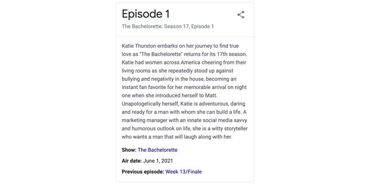 En este momento, Google está mostrando lo que parece ser una fecha de estreno tentativa para la próxima temporada de Katie Thurston de El bachillerato. Como se ve en la captura de pantalla a continuación, la tarjeta de Google perteneciente a El bachillerato La temporada 17 muestra actualmente una fecha de emisión del 1 de junio de 2021. La tarjeta describe muy claramente la temporada como de Katie Thurston, con detalles muy descriptivos sobre cómo se desarrolló su viaje. El soltero y como se siente al entrar en lo suyo El bachillerato viaje. Si esta fecha de estreno resulta ser acertada, cabe destacar que el 1 de junio aterrizará en martes, rompiendo con el horario tradicional de los Bachelor Mondays. Por otro lado, ese lunes anterior es el Día de los Caídos, que podría ser el motivo de un estreno el martes esa semana.