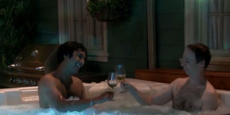 Sin decirle a nadie, los dos se quedaron en casa divirtiéndose. Pero de repente, escucharon que se encendía el jacuzzi. Sentado en su jacuzzi estaba Stuart. ¡Y poco después, apareció Raj! Los dos no se dieron cuenta de que Howard y Bernadette estaban en casa y se dieron la bienvenida a sus comodidades. Poco sabían, la pareja vio todo.