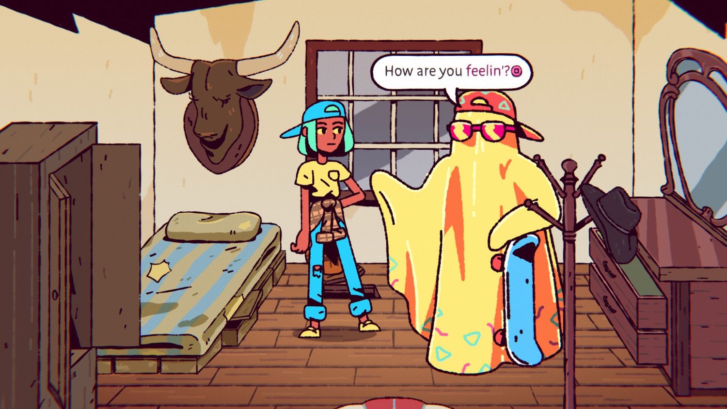 La escritura también es acertada, con mucho humor cómplice sobre los noventa que va más allá de las referencias obvias a cosas como el videoclub antes mencionado. La gran estafa pincha juguetonamente temas como anuncios de servicio público antidrogas gracias al siempre útil personaje secundario Rad Ghost, quien quizás encarna el ambiente de la década de 1990 mejor que nadie en el juego. Mientras tanto, este tono irónico se traslada a los metacomentarios sobre los juegos en sí, con algunos escritos ingeniosos.