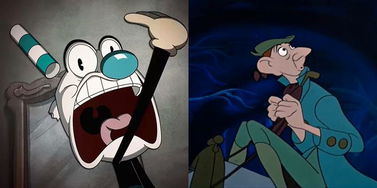 En el mismo episodio, Mugman se convierte en víctima del cliché de dibujos animados de una imaginación hiperactiva en un lugar espeluznante. Esto podría ser un tropo común, pero las imágenes seleccionadas para su locura son reconocibles casi instantáneamente no de uno sino de dos proyectos diferentes de Disney.