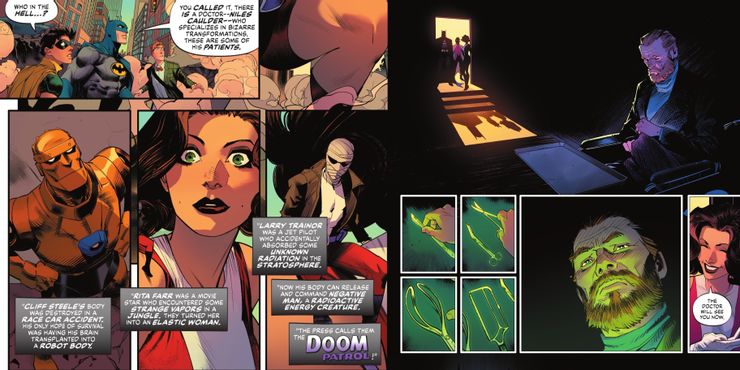 Afortunadamente, hay un equipo en DC Universe que se especializa en transformaciones de lo extraño y extraño. Dirigido por el doctor Niles Caulder, Batman llama a Doom Patrol para obtener la ayuda que tanto necesita. Con Robot Man (Cliff Steele), Negative Man (Larry Trainor) y Elastic Woman (Rita Farr), el equipo de inadaptados y marginados finalmente recibe un nuevo protagonismo que no habían tenido durante bastante tiempo en los cómics. No solo derrotan a Superman mientras sufre alucinaciones, sino que también llevan al Hombre de Acero al propio Caulder, quien tiene la intención de operarlo con herramientas quirúrgicas mezcladas con kryptonita verde.