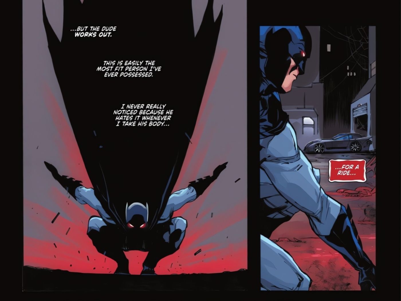 En terrores de caballero #1 por Joshua Williamson, Giuseppe Camuncoli, Stefano Nesi y Caspar Wijngaard, Deadman ha poseído a Batman para luchar contra la forma física de un nuevo villano que amenaza al mundo entero: el autoproclamado Dios de las Pesadillas llamado Insomnia. Insomnia busca un artefacto conocido como Nightmare Stone, ya que su objetivo es controlar el mundo a través de sus pesadillas. Cuando Insomnia tiene a Deadman/Batman contra las cuerdas proverbiales durante su pelea en la cima de Arkham Tower, Deadman no puede pensar en otra cosa que hacer más que usar el cuerpo de Batman para saltar a través de una ventana y aterrizar de manera segura en el suelo debajo, usando su propia experiencia como ex trapecista para asegurarse de que el cuerpo de Batman salga con vida. En su camino hacia abajo, Deadman comenta lo bien que Batman cuida su cuerpo y dice: “el tipo hace ejercicioseguido de un comentario bastante llamativo, “Esta es fácilmente la persona más en forma que he poseído”.
