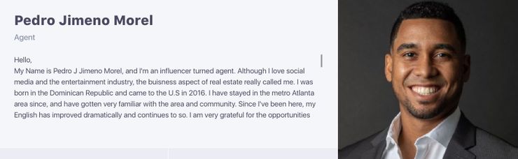 muchos de El canto de la familia Los fanáticos también criticaron a Pedro por decir que tiene “hogar“ser muy”sagradoen su propia biografía, donde se describe a sí mismo como un “Influencer convertido en agente.Además de Laura, Antonella y Pedro, Dayana Díaz figura como “Asistente/secretaria de Laura [sic].” Yerly Ferreira también aparece como un nuevo agente. Si bien Laura, Antonella y Yerly tienen números de identificación de agente para sus licencias de bienes raíces, Pedro no tiene uno en la lista. No está claro si esto es un error o si Pedro es no es un agente de bienes raíces con licencia todavía. Los cinco miembros del equipo tienen sus biografías en español e inglés, ya que la agencia tiene como objetivo servir a las personas de habla hispana. Hay enlaces disponibles para que los clientes interesados compren o vendan una casa con la empresa.