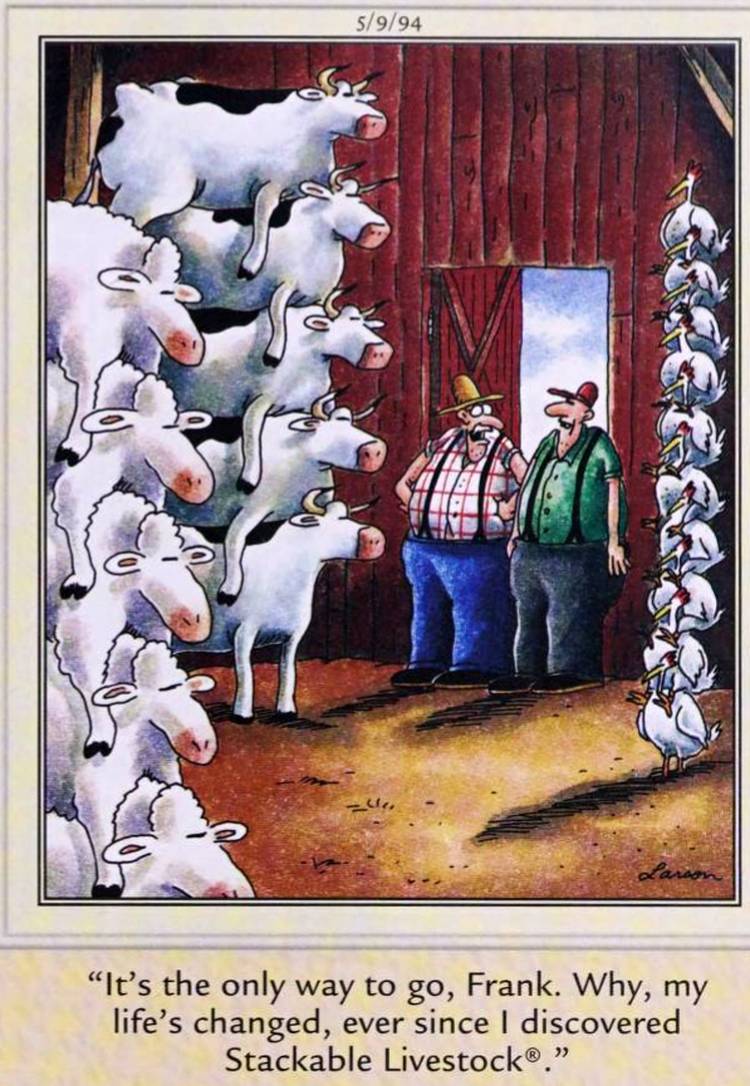 Este Lado lejano La caricatura se destaca como particularmente extraña, incluso entre la obra notoriamente extraña de Gary Larson. “Mi vida ha cambiado, desde que descubrí el ganado apilable“, le dice un granjero a su amigo, mostrando sus ovejas, vacas y, por supuesto, gallinas cuidadosamente apiladas.