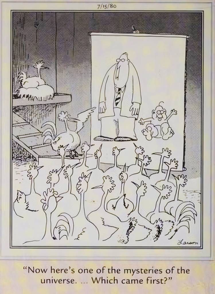 Eso incluye éste, en el que un pollo señala la imagen de un hombre adulto, junto a la de un bebé, y sermonea a sus compañeros, “Ahora aquí está uno de los misterios del universo… ¿cuál fue primero?“ en un tono perfecto Lado lejano inversión de la eterna pregunta del “huevo o la gallina”.