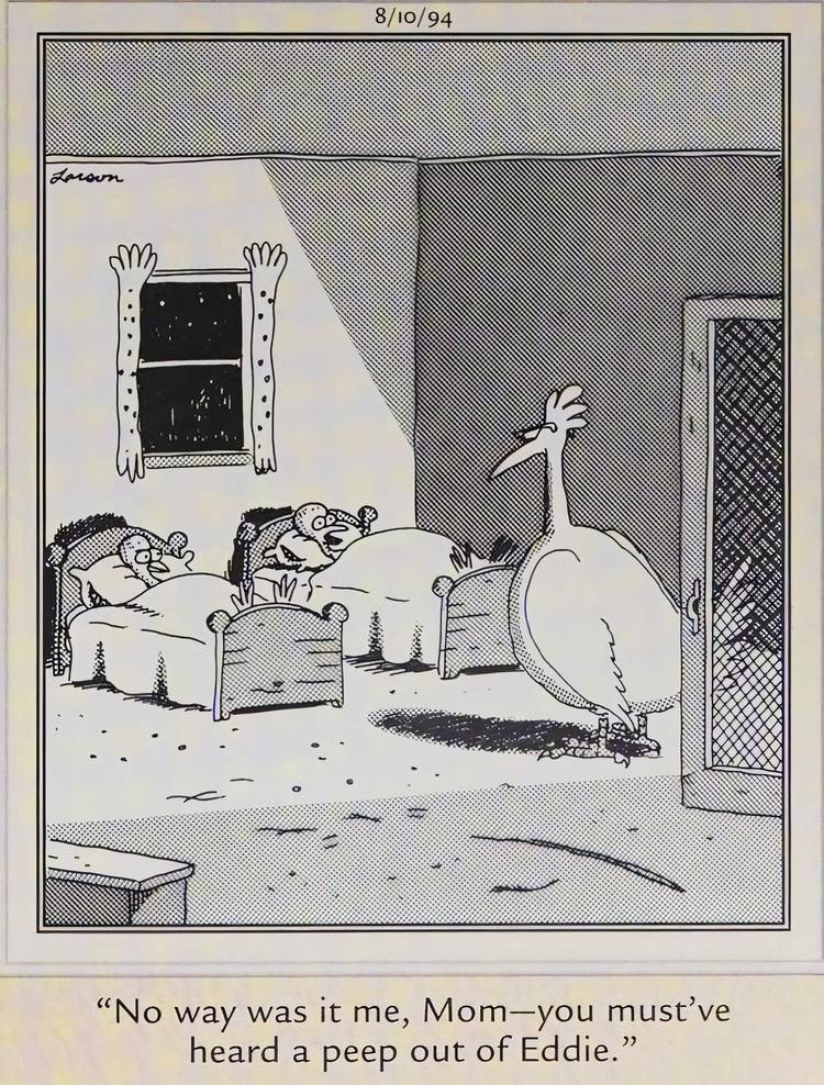 Acostar a los niños por la noche era otra práctica semi-regular. Lado lejano tropo, y este es uno de los últimos que produjo Gary Larson. Aquí, una mamá gallina se encuentra al pie de la cama de sus hijos, mientras un pollito culpa al otro por hacer ruido después de la hora de dormir, diciendo “De ninguna manera fui yo, mamá. ¡Debes haber escuchado un pío de Eddie!”