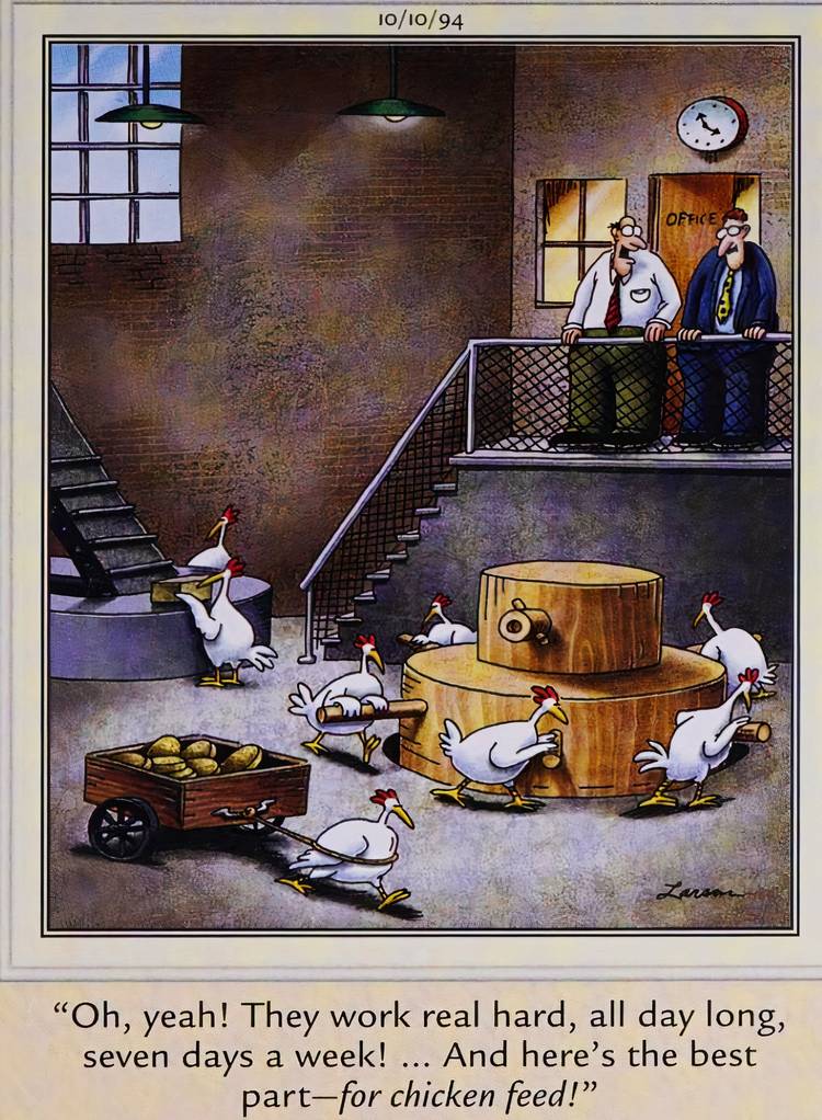 Aunque Gary Larson negó Lado lejano Los cómics tenían un significado más profundo, sus opiniones y sentimientos saturaban la caricatura y, como resultado, se puede extraer fácilmente una forma de crítica social de al menos parte de su trabajo. Ese es ciertamente el caso aquí, ya que Larson comenta sobre las prácticas laborales inhumanas al hacer que sus personajes literalmente no sean humanos.