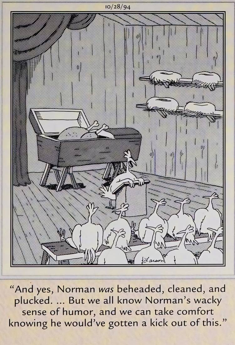 El lado lejano El panel final del pollo presenta un funeral, lo cual es apropiado considerando que es la última de las apariciones icónicas de los pájaros en la obra maestra de Gary Larson. El funeral en cuestión es para un pollo llamado Norman, OMS “fue decapitado, limpiado y desplumado” – con un pollo cocido que sobresale hilarantemente de un ataúd abierto.