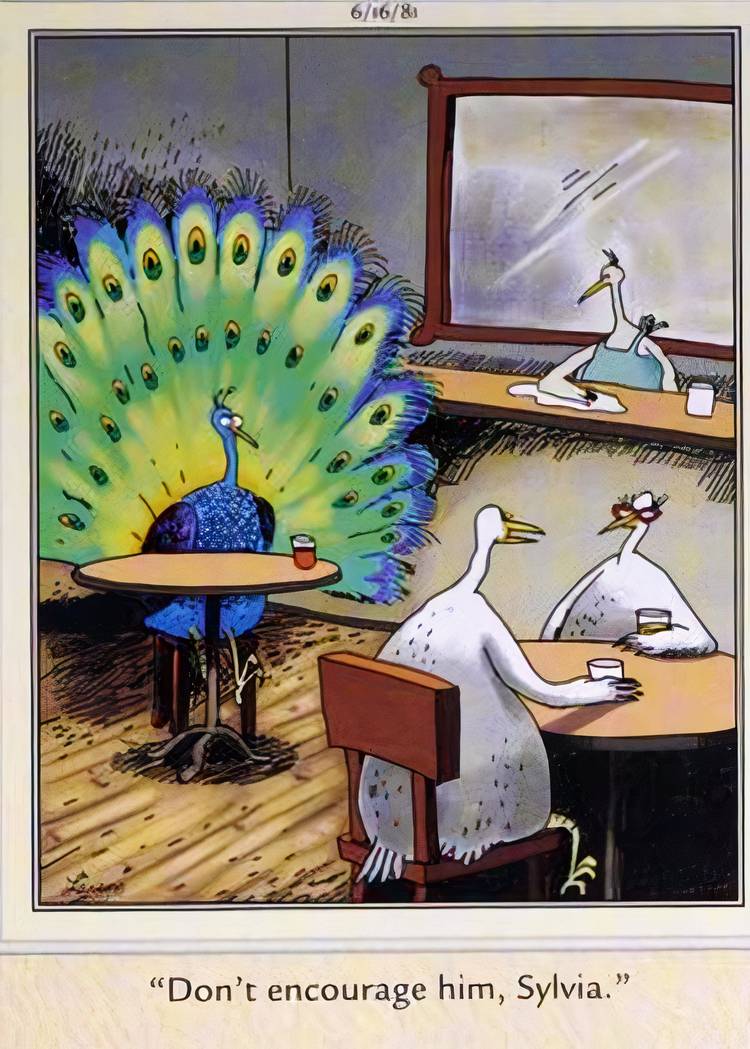 Gary Larson a menudo destacó la extrañeza innata del comportamiento humano al intercambiar animales, pero aquí va un paso más allá al presentar al personaje humano, en mitad del comportamiento, frente a su espejo deformado, en la forma de un pollo que se escapa con un niño. Es extraño y surrealista, y muestra otra subida de nivel de Larson. Lado lejano chistes de pollo.