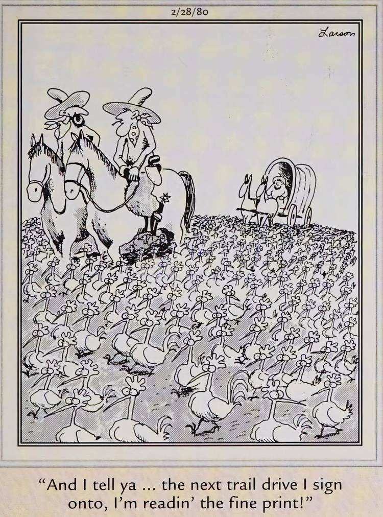 Los lectores se sorprenderán al descubrir que las gallinas eran casi una ocurrencia tardía en su Lado lejano debut. Es decir, en este panel, no son el foco del remate, aunque juegan un papel integral para hacerlo divertido. “¡El próximo recorrido por el sendero al que me inscribo, estoy leyendo la letra pequeña!” dice un ladrón de ganado descontentohabiendo aceptado este trabajo esperando vacas y, en cambio, pastoreando gallinas.