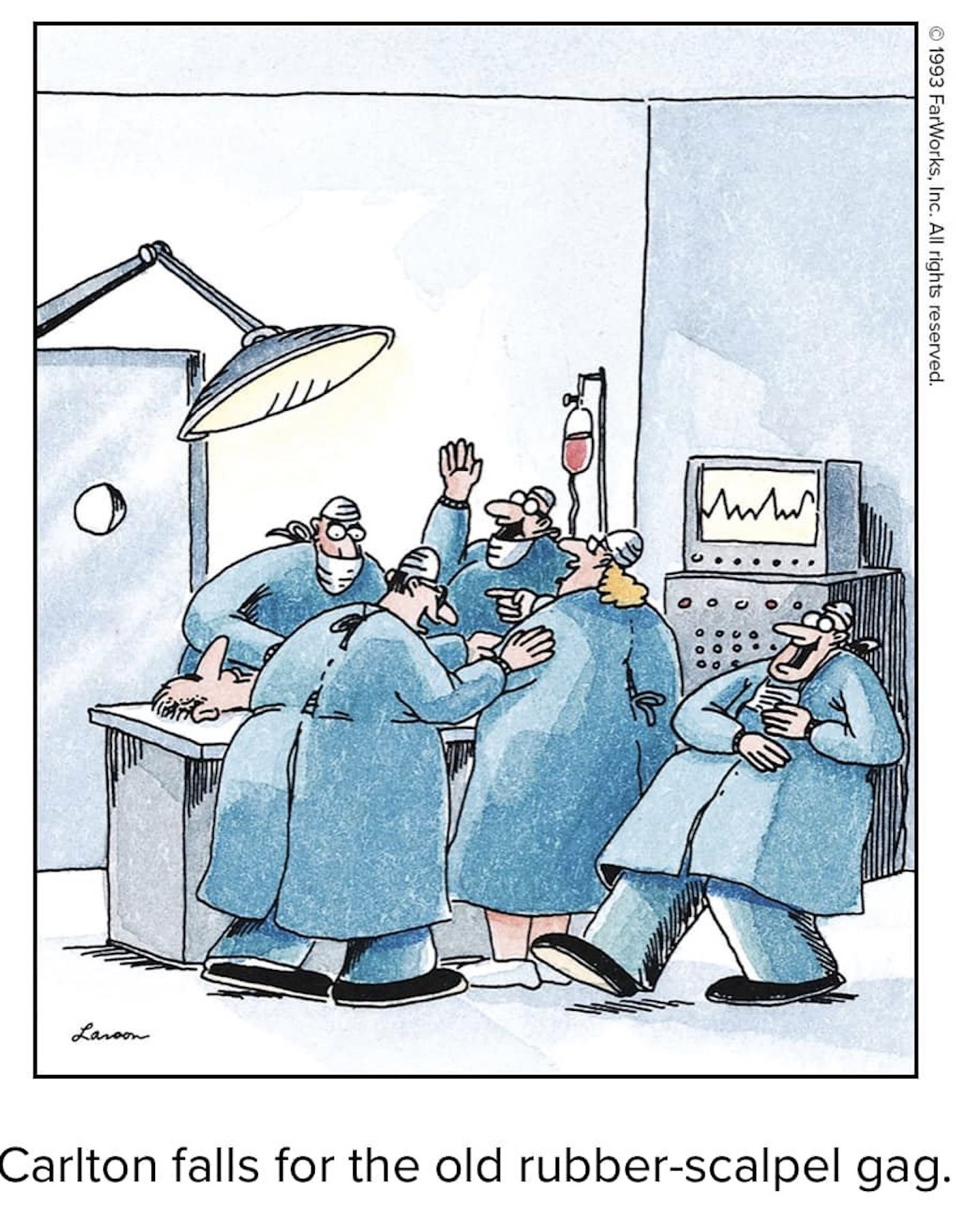 - Los médicos hacen bromas durante la cirugía en los cómics de Larson, convirtiendo los momentos serios en absurdos.