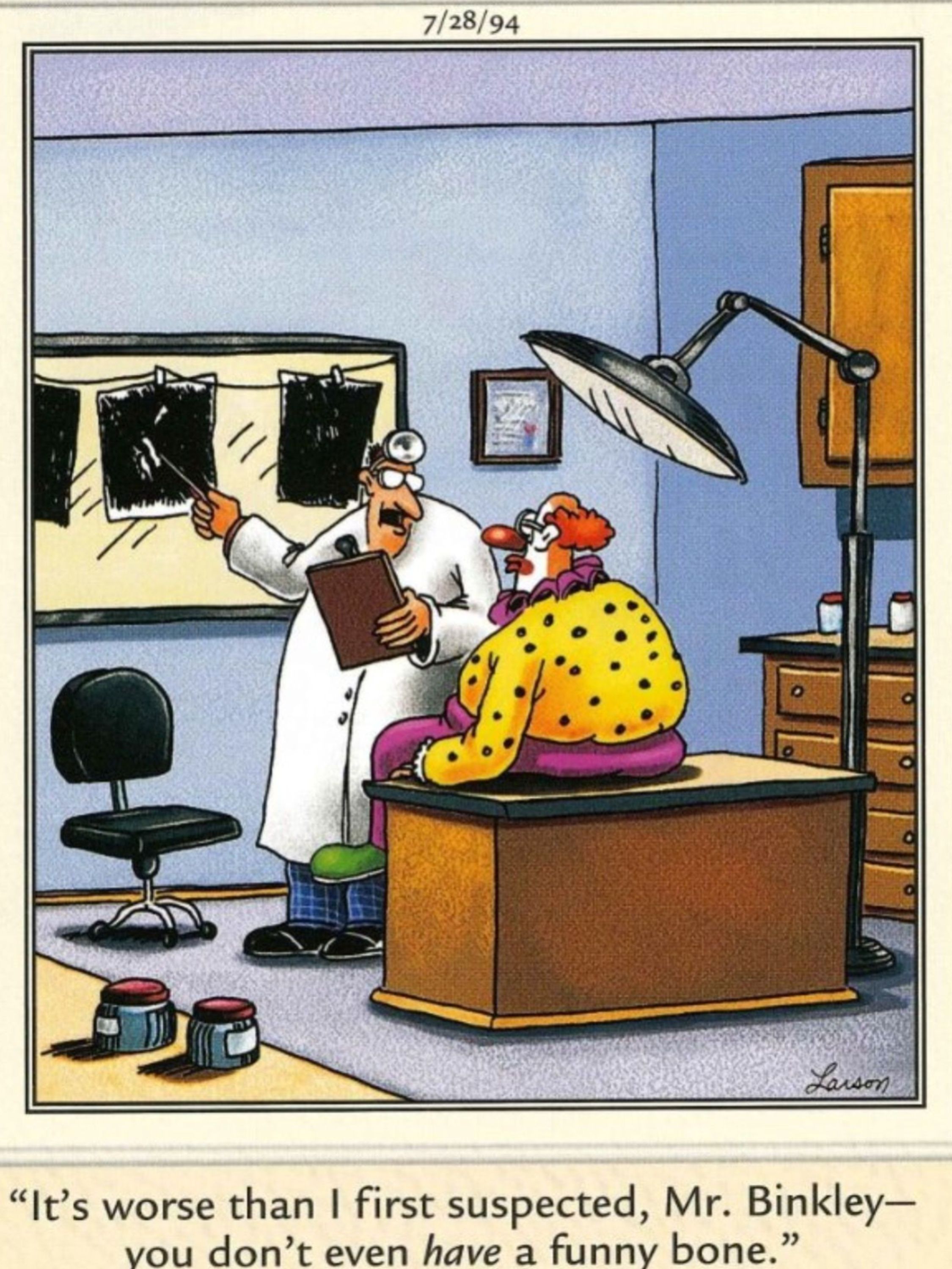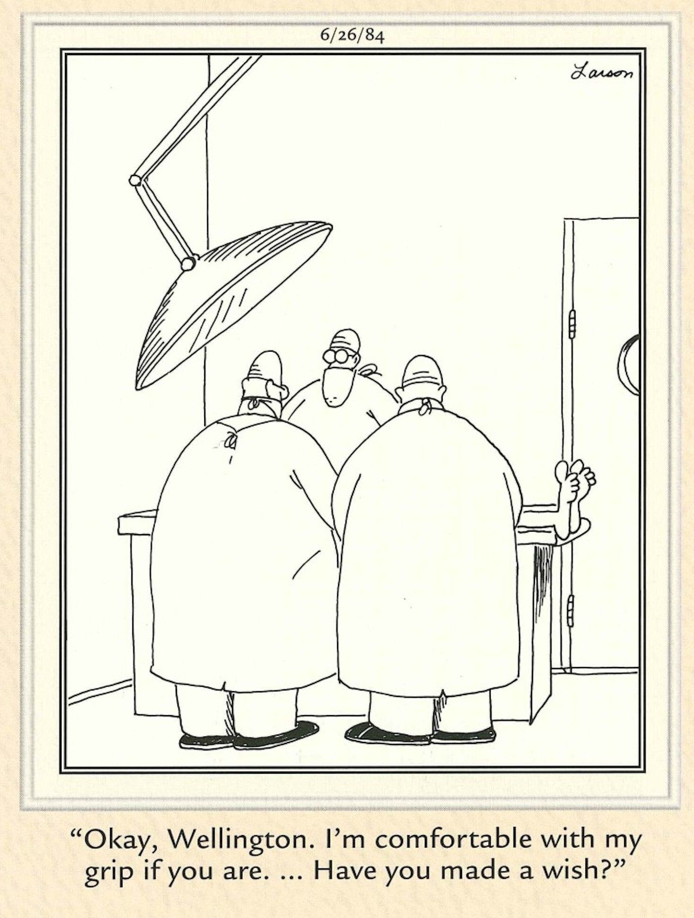 Es bastante seguro apostar que algo que vuela por el aire durante una cirugía no es ideal, especialmente cuando ese objeto volador es una parte del cuerpo. Larson sabe cómo pintar una imagen igualmente divertida y que induce al escalofrío, como lo muestra esta tira cómica. Una parte del cuerpo, todavía atada al paciente, ha saltado por el aire, pero al menos uno de los médicos tiene el buen sentido de saberlo y seguirlo. La ridiculez se ve amplificada aún más por la incertidumbre de aquel médico, que se refiere a la parte del cuerpo como “esa cosa” y dice que “probablemente necesito.“Nunca es bueno enfermarse, pero es absolutamente horrible enfermarse y ser tratado por estos médicos poco estelares en el Lado lejano.