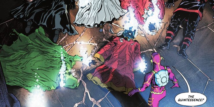 La Quintaesencia es un grupo de seres parecidos a dioses que vigilan el multiverso. Dan testimonio de cada momento; pasado, presente o futuro. Después de los eventos de Noches oscuras: Death Metal, la Quintaesencia afirmó que el Multiverso había sido restaurado y que no percibían nuevas amenazas. Al final de Frontera Infinita # 0, se revela que atraparon en secreto a la mayor amenaza del universo, Darkseid, en Earth-Omega. Sin embargo, de alguna manera Darkseid logra liberarse de su prisión, tomando a la Quintaesencia con la guardia baja y matándola. En este número, han pasado un par de semanas desde su muerte, según Flash, quien se sorprende al presenciar los cadáveres de los dioses de DC.