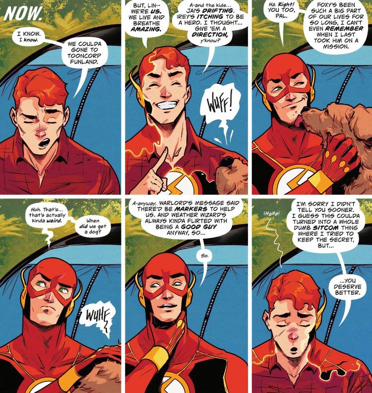 En El destello #14 de Simon Spurrier, Vasco Georgiev, Matt Herms y Hassan Otsmane-Elhaou, Wally y su familia se están embarcando en unas vacaciones muy necesarias después de que su batalla con los Arc Angles casi los destroza para siempre. Les acompaña en su viaje de campamento su perro, Foxy, que encaja perfectamente con ellos. El único problema con esto es que La familia de Flash nunca antes había tenido un perro, pero ahora actúan como si Foxy siempre hubiera estado presente.