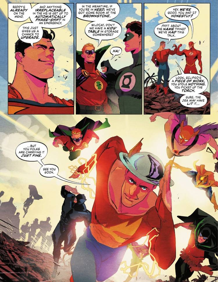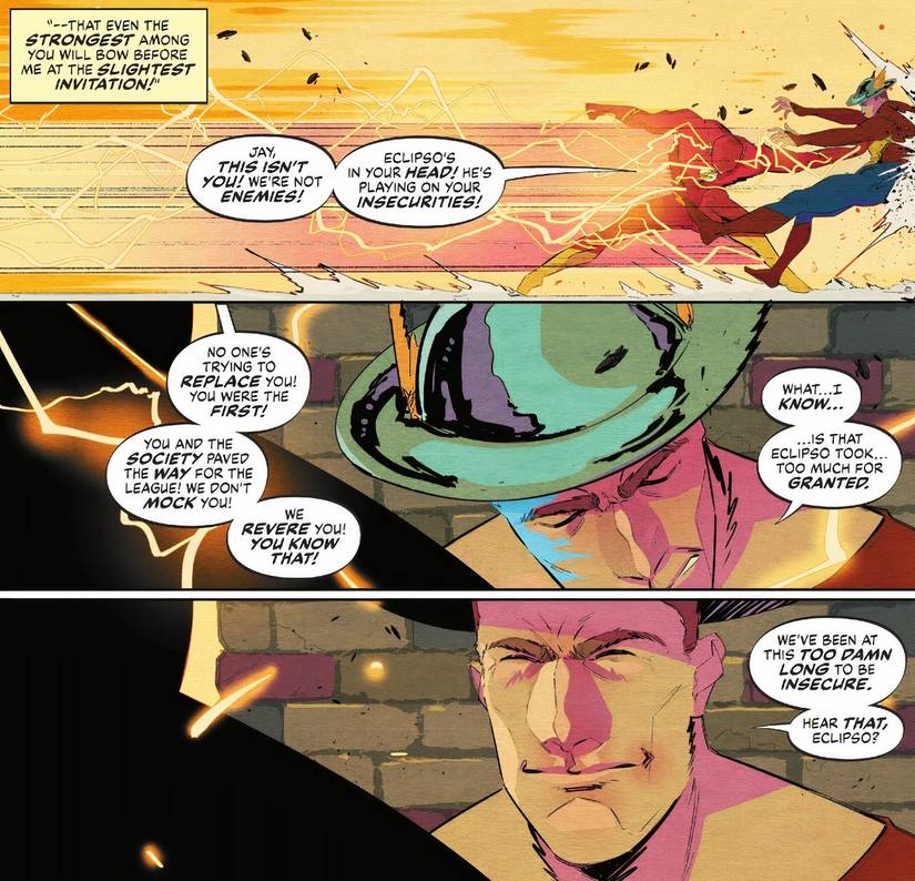 Una vez que el polvo de la pelea contra Eclipso se ha calmado, Barry Allen le pregunta a Jay si las cosas van bien entre ellos. Como deduce Jay, Barry se refiere al título de Flash que le “robó”. Después de todo, Jay Garrick fue el primer Flash y Barry asumió el mando de seguir sus pasos. Jay le asegura a Barry diciéndole: “No robaste nada. Recogiste la antorcha”. Con estas palabras, Jay muestra su agradecimiento por que Barry continúe con lo que empezó. Si el Universo DC está lleno de Flashes, es porque lo prefieren así, y esta noción distingue a Flash de otros héroes prolíficos.