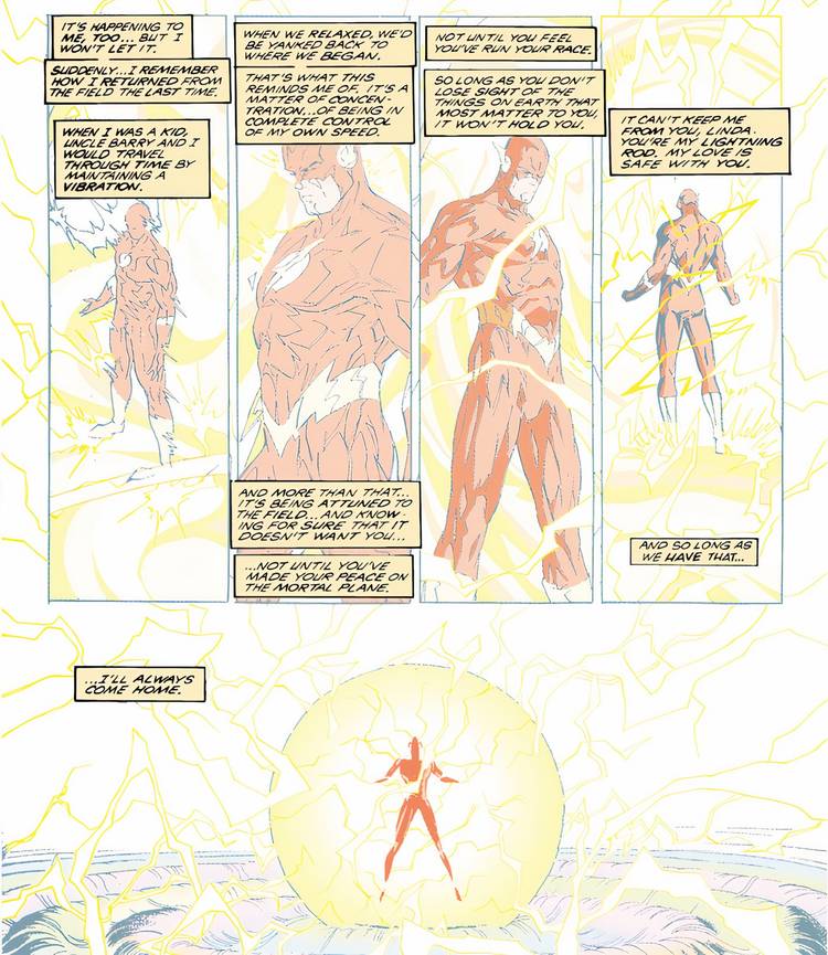 El intento de Flash de alejar a sus seres queridos casi resulta en la destrucción del tiempo. Una vez que ha abandonado sus vínculos con la realidad, los Arc Angles manipulan al ahora vacío Flash para que cumpla sus órdenes y envenene el tiempo en su origen. Posteriormente, cuando todo parece perdido, aparece una manifestación de los sentimientos robados de Linda y le recuerda a Wally que lo aman. Ninguna fuerza en el universo, desde el control mental de Abra Kadabra hasta los Arc Angles, puede romper su vínculo inquebrantable. El amor de Wally y Linda persiste incluso después de que el tiempo se detieney siempre lo será.