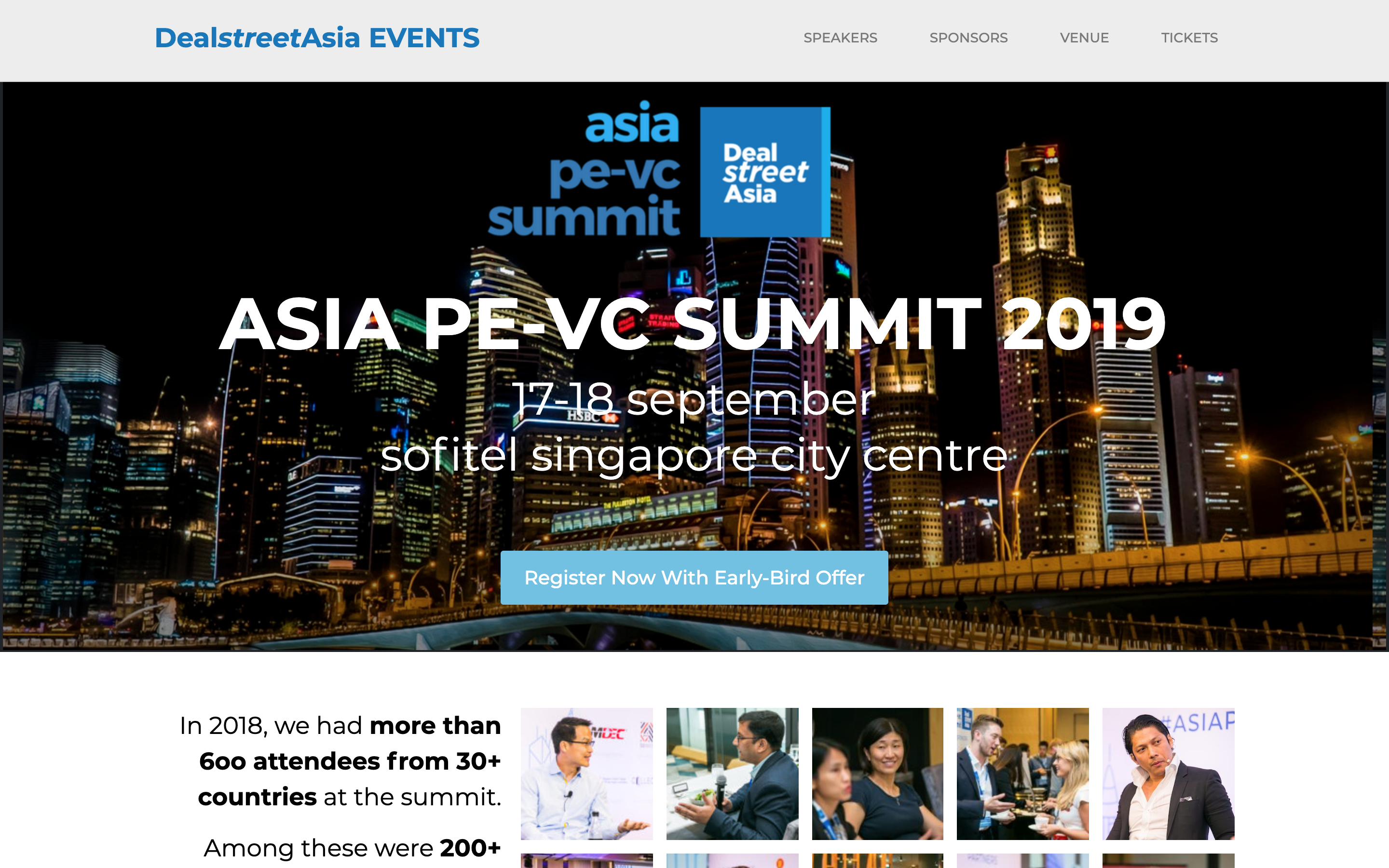 Los eventos de Deal Street Asia están dirigidos a una multitud de negocios. Por ejemplo, su cumbre principal en Singapur en septiembre cuesta más de $ 1,000 y cuenta con ejecutivos de alto nivel como DBS, Grab, Sea, GGV, Allianz e IFC.