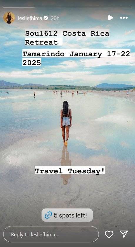 El Retiros de belleza de Ketanga El sitio web todavía ofrece a los usuarios la posibilidad de reservar el viaje, que costará $2,325 para una habitación doble o $2,995 para una habitación individual. El retiro de fitness será organizado nada menos que por la propia Leslie.que tiene experiencia en fitness y baile. Soul612 es su negocio centrado en el fitness. El retiro se llevará a cabo durante seis días y cinco noches, e incluirá entrenamientos con Leslie, viajes de un día, excursiones y más.