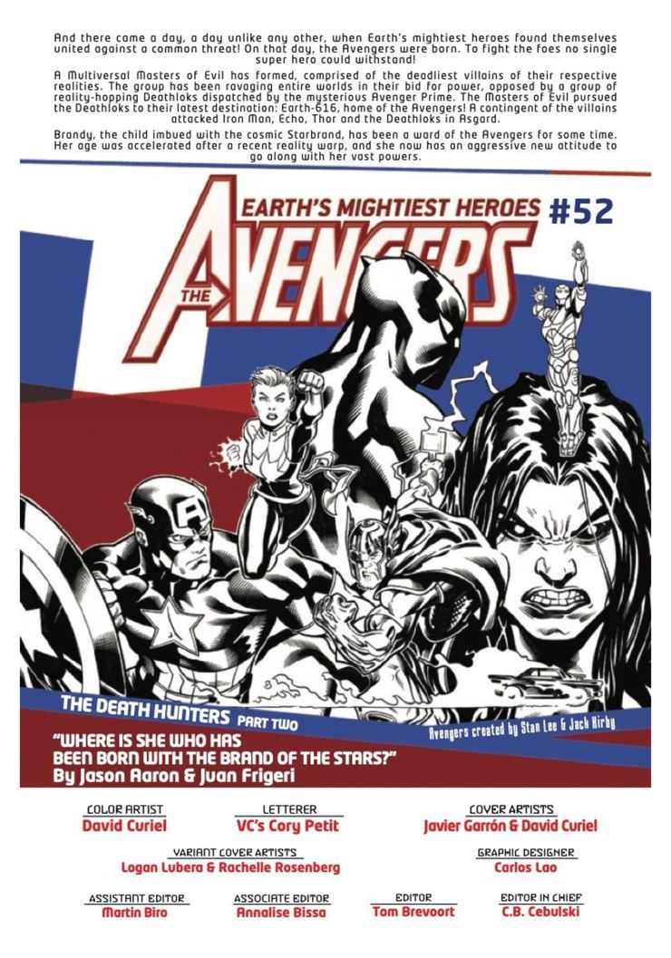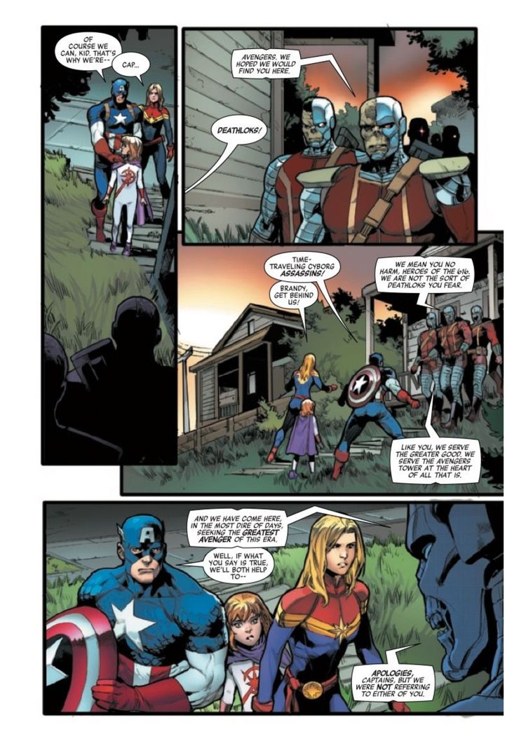 En una nueva vista previa de Vengadores # 52 de Jason Aaron, Juan Frigeri, David Curiel y Cory Petit de VC, un grupo de Deathloks se enfrenta al Capitán Marvel, el Capitán América y Starbrand. Sin embargo, los asesinos cyborg que viajan en el tiempo no están allí para iniciar una pelea. En cambio, revelan que sirven al bien común y a la Torre de los Vengadores en el corazón de todo lo que es. Los Deathloks buscan al vengador más grande de la era, pero no es el Capitán América, el Capitán Marvel o el Fénix de Echo. En cambio, confirman que están detrás de Starbrand.
