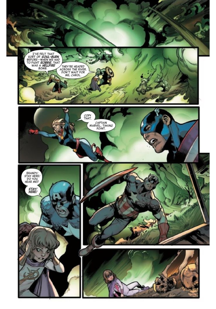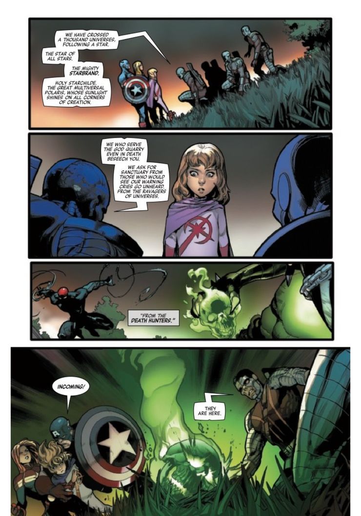 Los Deathloks confirman además que han cruzado miles de universos siguiendo a “la estrella de todas las estrellas”, también conocida como Mighty Starbrand. Al describir a la heroína que consideran la vengadora más grande de la era, la llaman la “santa Starchilde, la gran Polaris multiversal, cuya luz del sol brilla en todos los rincones de la creación”. La reunión es interrumpida por un grupo de Cazadores de la Muerte, lo que lleva al Capitán América y al Capitán Marvel a entrar en acción. Steve Rogers le dice a Starbrand que se mantenga calmado y quieto. Con suerte, los Cazadores de la Muerte no alcanzarán a la joven heroína mientras sus compañeros Vengadores continúan luchando.