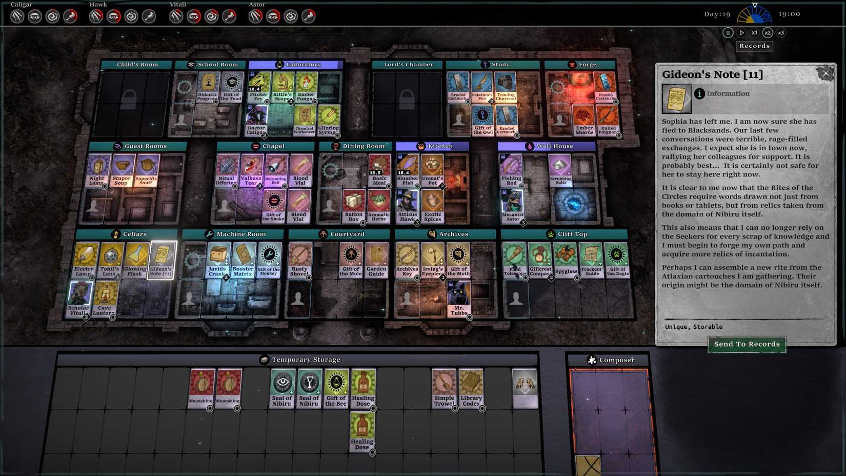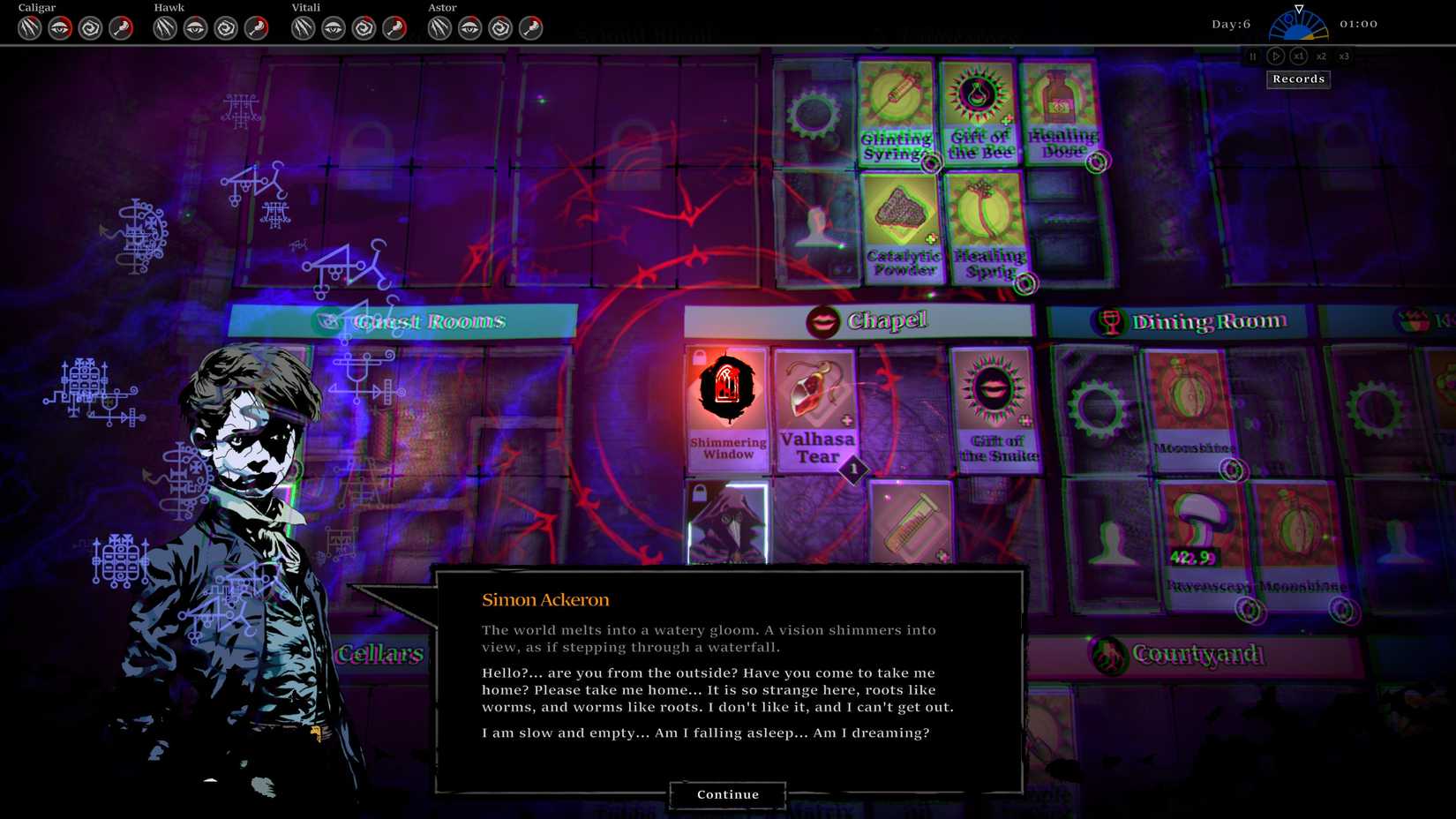 Para tener una idea de cómo funciona todo, imagine que hay varias habitaciones en forma de cuadrícula ante usted. Para buscar carne, puede arrancar la tarjeta Atticus y combinarla con un conjunto de binoculares en la parte superior del acantilado, lo que activa una búsqueda de alimentos. Luego puede arrastrar el retrato de Astor a la cocina con una tarjeta de carne y preparar una comida. Finalmente, Vitali se puede sentar en el comedor con la cena y consumirlo para detener su hambre.