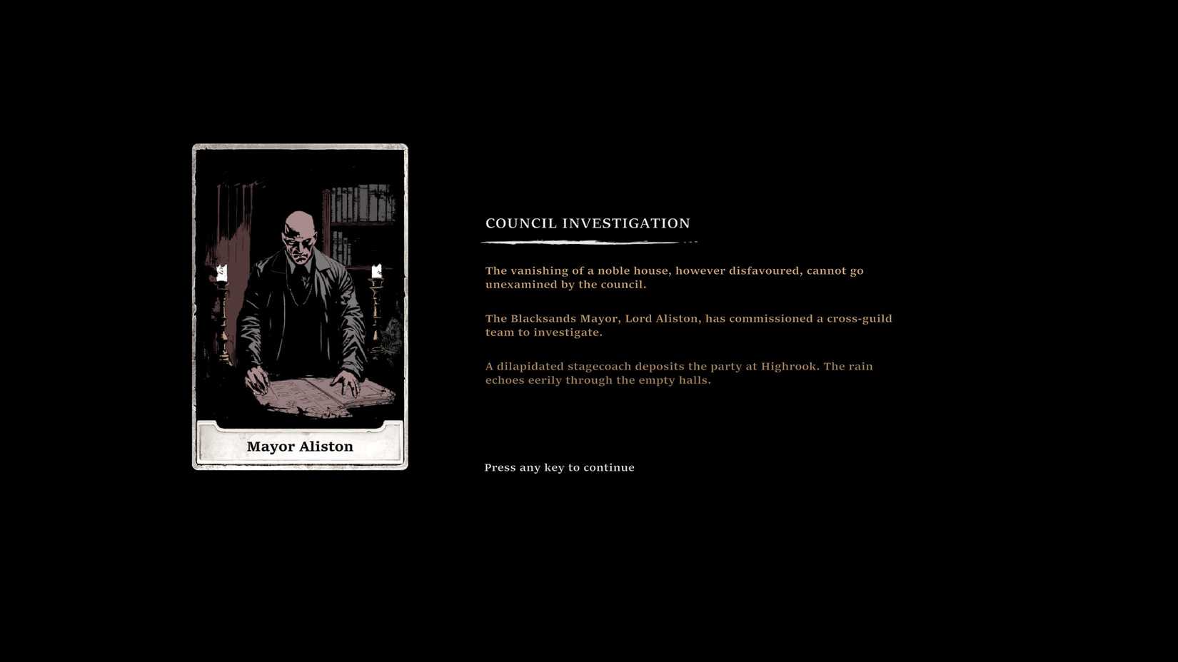 Highrook Estate fue una vez el hogar de Ackerons, una familia educada de la corteza superior cuyo patriarca hambriento de conocimiento, Gideon, se aventuró demasiado lejos en un agujero de conejo de conocimiento oculto. Su abrupta desaparición perturba a los residentes de Blacksand, lo que lleva al alcalde a reclutar a cuatro miembros del gremio para desentrañar su destino sospechoso.