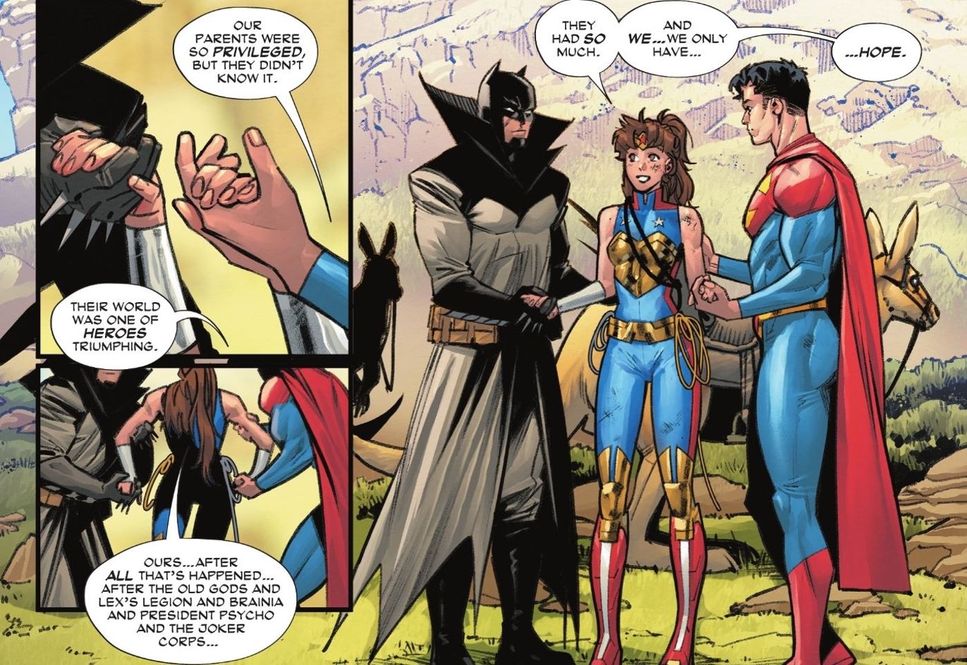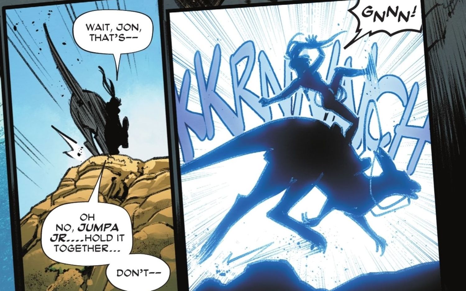 En Mujer Maravilla #5 En la historia de respaldo “World’s Finest: Part 3” de Tom King y Belen Ortega, Trinity, la hija de Wonder Woman, desafía a Batman y Superman a una carrera de kanga para determinar el nombre de su equipo. Trinity toma la delantera pero termina cayéndose de su montura.