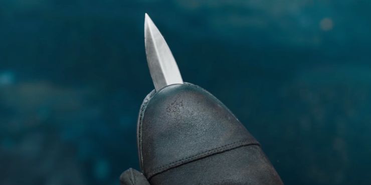 En Kingsman, Eggsy usa memorablemente zapatos con cuchillas especiales mientras lucha con Gazelle, que están cubiertos con veneno en la cuchilla. El hombre del rey hace referencia a este atuendo cuando Orlando está atrapado en la ladera de la montaña helada. Él origina el armamento del calzado cuando clava las hojas de sus cuchillos en la punta de cada zapato, lo que le permite aferrarse al hielo y escalar el acantilado con picos de hielo improvisados.