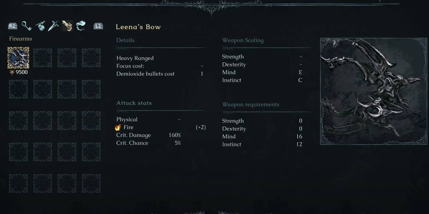 Tu construcción debe tener al menos 16 Mente y 12 instinto para empuñar el arco de Leena, que dispara un láser concentrado de fuego puro que consume balas mientras mantienes presionado el botón de ataque. Esta arma tiene una escala E con Mente y un escala C con Instinto, convirtiéndola en una herramienta definida por ambos atributos. No necesitas una puntuación de requisito previo en Fuerza o Destreza para usar el Arco, aunque es una herramienta física en La última fe.