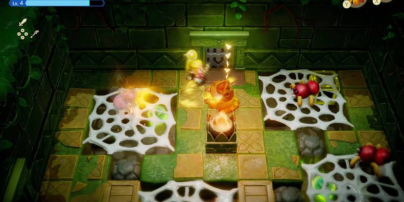En la siguiente área, verás un grupo de arañas que intentarán luchar contra ti. Puedes transformarte para luchar o simplemente usar algunos de tus ecos para luchar por ti. Asegúrate de utilizar un luchador que use fuego, como Fire Wizzrobe. De esta manera, el fuego también puede encargarse de las correas. Una vez hecho esto, puedes usar las chispas a continuación para llenar las cajas que aparecen cuando destruyes las correas.