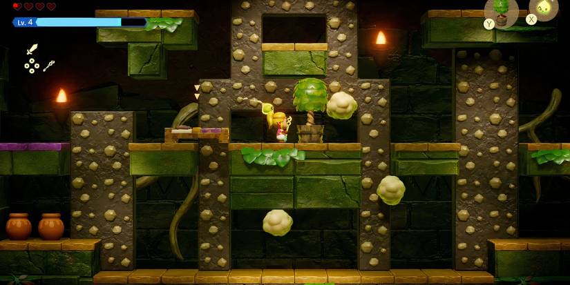 Desde aquí vas a bajar por una escalera que cambia La leyenda de Zelda: Ecos de sabiduría a una vista de desplazamiento lateral. Se espera que usted Usa agua para subir a los niveles superiores.pero asegúrate de cronometrar bien tu ascenso. Las chispas dentro del agua tienen un área de efecto aumentada, lo que causará daños si estás demasiado cerca. Después de llegar al nivel superior, encontrarás 20 rupias en un cofre. Continúe y continúe hacia la derecha, usando la escalera de agua donde sea necesario.