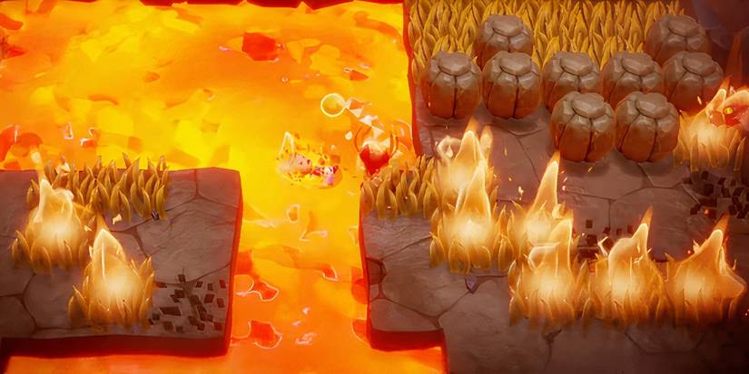 Una vez que hayas pasado por la última área en La leyenda de Zelda: Ecos de sabiduríaestarás en uno nuevo con áreas que están en llamas. Esta parte es bastante sencilla, simplemente recorre la zona y evita permanecer en el césped el mayor tiempo posible. Los monstruos de fuego que hay alrededor prenderán fuego a la hierba, así que mantente alejado de ellos. Alternativamente, puedes quedarte quieto y esperar a que la hierba alta se queme y luego seguir adelante. No toques a los monstruos de fuego porque te lanzarán hacia atrás, lo que podría arrojarte a la lava.