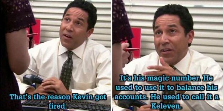 Para probar el punto de Dwight, Oscar dijo a las cámaras que Kevin era tan mal contador que creó un número inventado llamado “Keleven”. Usaba el número inventado cada vez que sus matemáticas no cuadraban, para poder llegar a casa a tiempo.