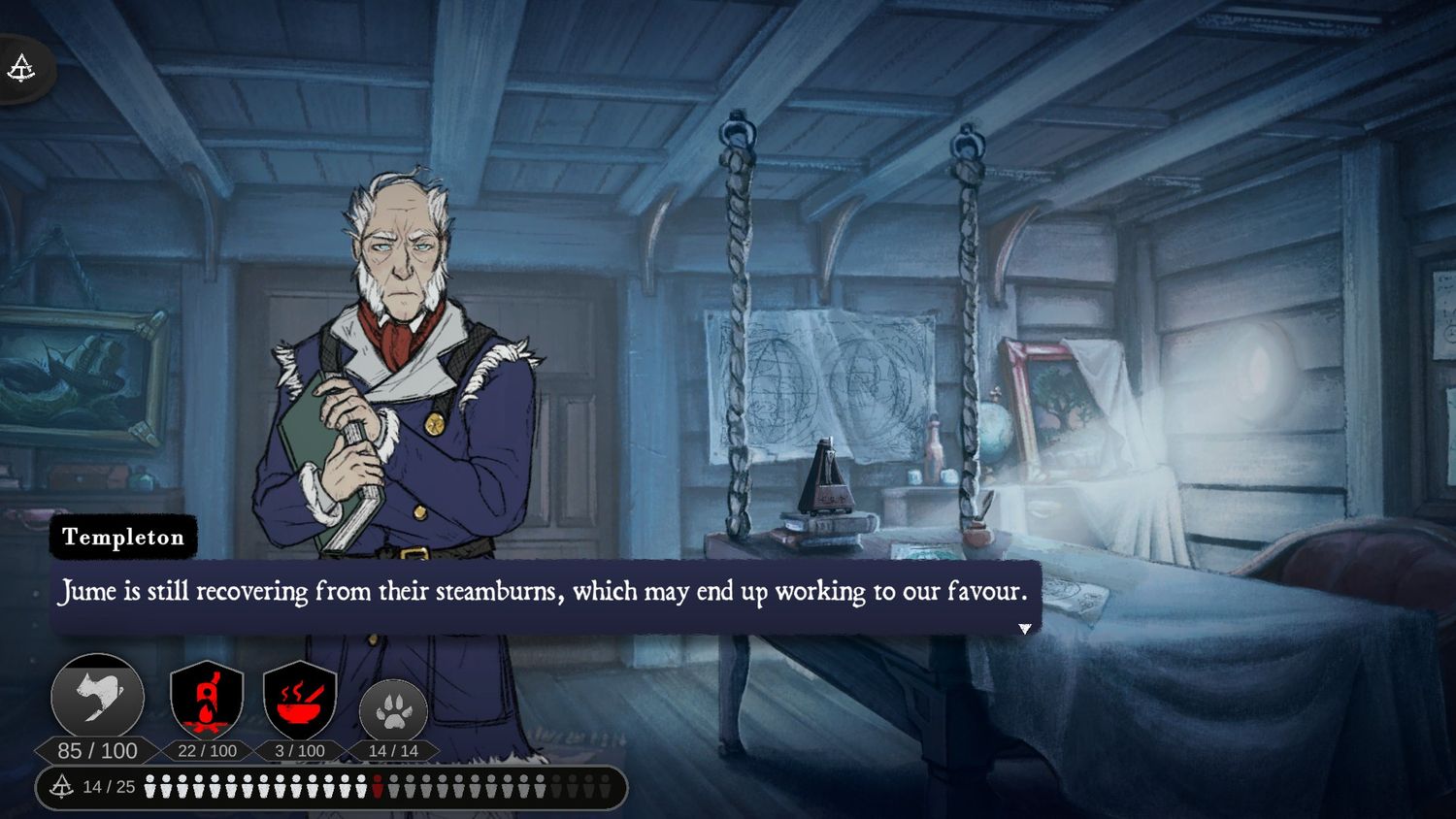 Los personajes que Shaw conoce a bordo del Templanza son una parte crucial del sabor El pálido más allájugabilidad de . Cada día trae tareas regulares y asignación de recursos, pero también presenta nuevas conversaciones a través de las cuales Shaw puede aumentar o disminuir su favor con los miembros de la tripulación. Estos son personajes creíbles y generalmente atractivos, y los más memorables adquieren rasgos únicos para sobresalir sin desviarse hacia el reino de los dibujos animados. Cuando el capitán del barco desaparece en el hielo, ganarse el favor de diferentes individuos y facciones sueltas se vuelve crucial para mantener el control de la expedición.