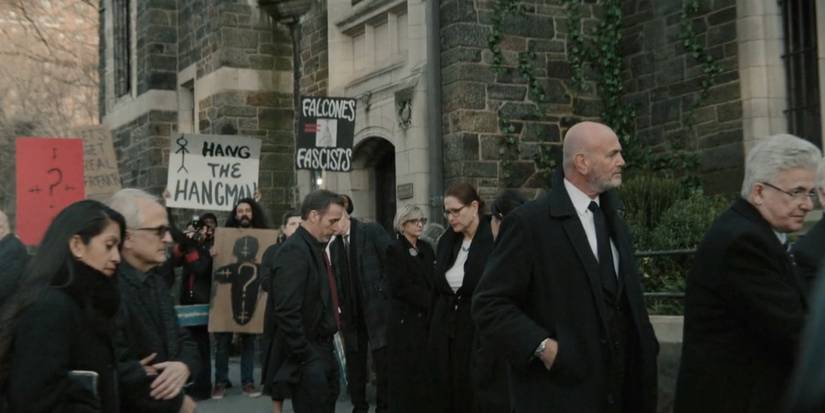 En el servicio conmemorativo de Alberto Falcone, se puede encontrar un grupo de manifestantes afuera de la iglesia. Mientras que algunos sostienen carteles de protesta por la liberación de Sofia Falcone como El Ahorcado, otros tienen carteles con los símbolos de interrogación verdes de El Acertijo.. Al igual que los volantes repartidos en el pingüino En el estreno, los carteles en la protesta confirman aún más que Nashton todavía tiene seguidores en toda Gotham a pesar de su encarcelamiento en Arkham.